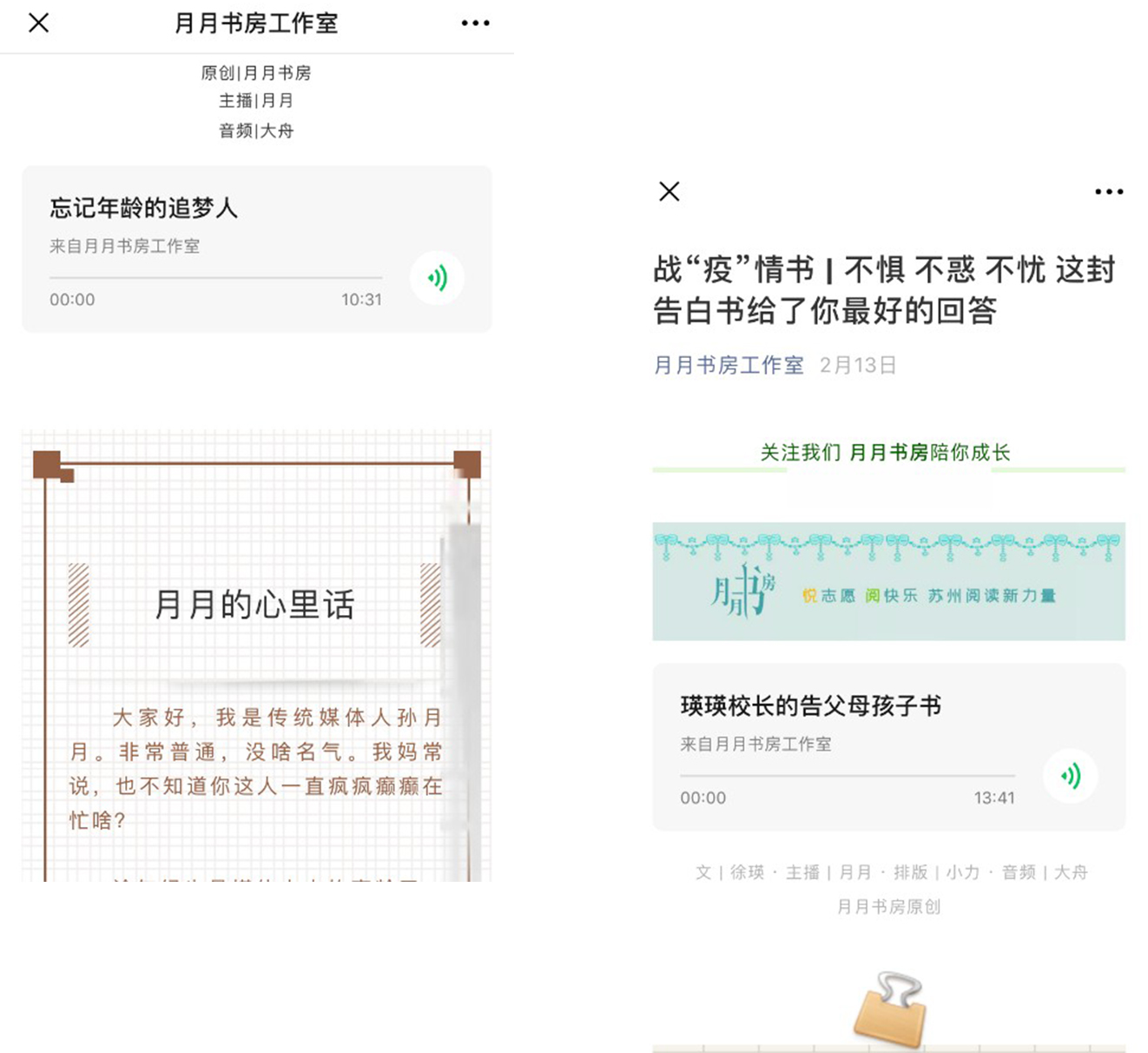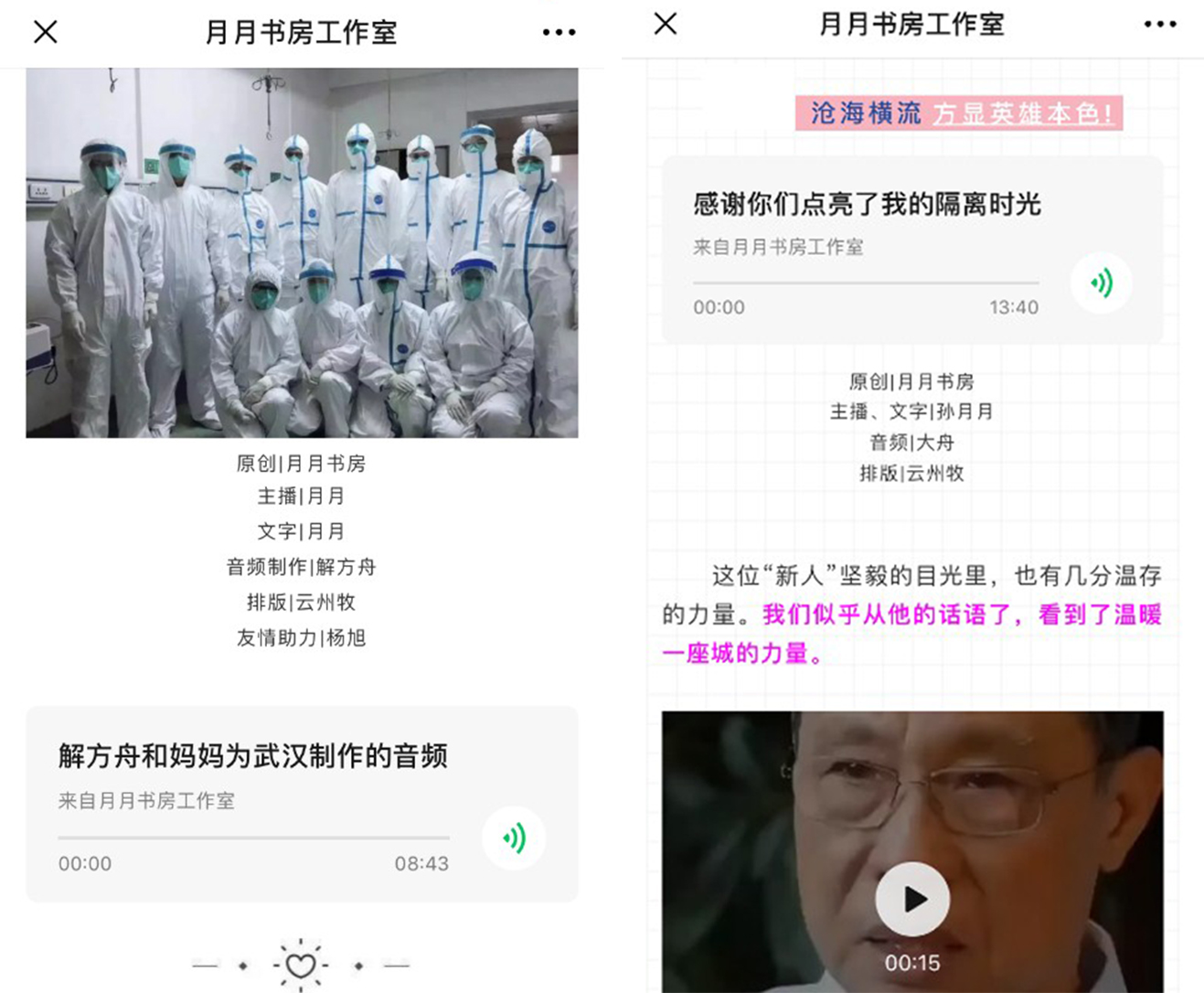 解方舟同学在疫情防控期间为了记录和分享那些德才兼备的科研、军事技术人员、一线的医护、教育工作者,舍小我成大我的普通劳动者的故事,与妈妈在家自制《月月书房工作室》公众号推文和音视频,完成了六集战疫情书的音频录制、剪辑。从“和你读冠状病毒绘本,那些拥有超强免疫力的“新人”,到“线下停课、不意味时间的停滞”,“等风雨后,我们一起再去赏花”等等。刚开始她连下载音乐,制作音频都不熟悉,但是她带着一股子倔强地说:“我想试一试,我可以!”从录音,到学习软件,制作音频,到自制Vlog,Plog,积累生活的点滴微光……让我们看到了“00后”身上,这种不肯服输的学习力和强烈的责任感。