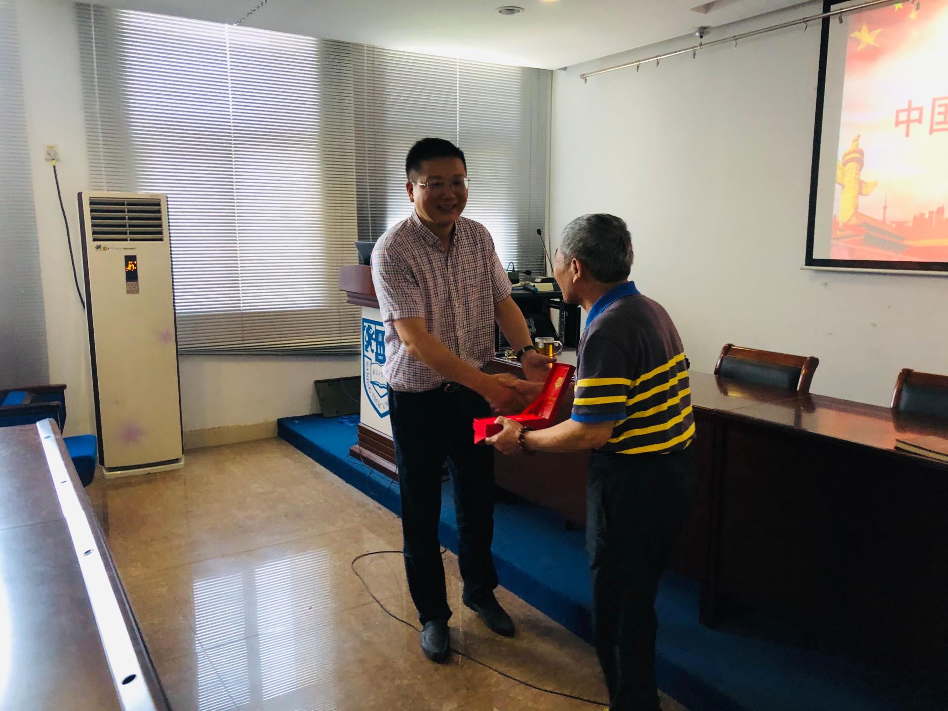 6月24日,公司在博学楼633举办党员大会,向党龄达到50周年的黄星老师颁发“光荣在党50年”纪念章。公司党委书记顾永东向黄星颁发“光荣在党50年”纪念章,感谢其长期对公司教育事业的奉献。黄星同志戴着奖章格外激动,表示纪念章的发放,代表的是党和国家对老党员们的认可和信任,自己感到非常光荣 ,将继续发扬党的光荣传统和优良作风,更好发挥余热,竭诚服务人民。