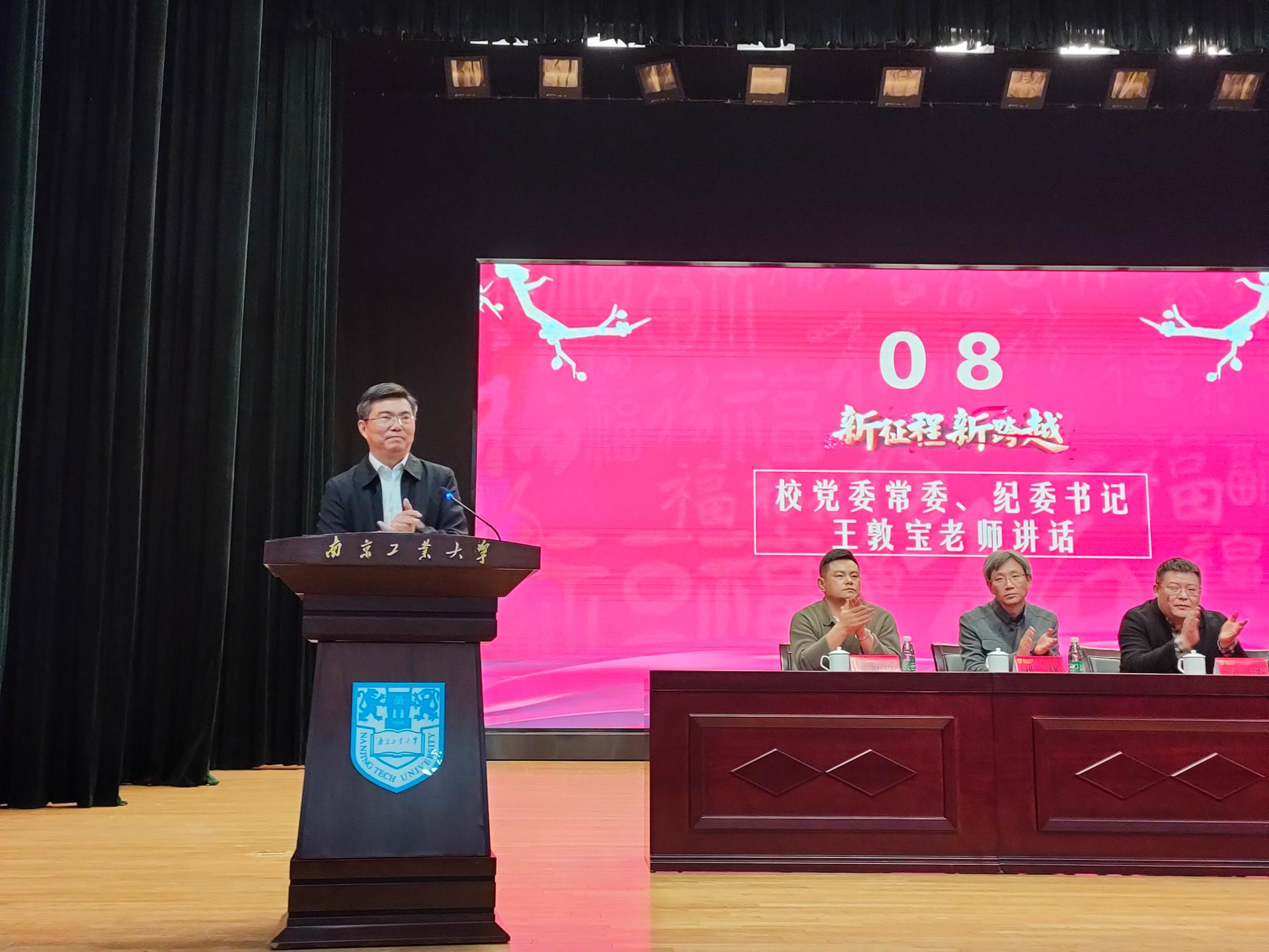 最后,公司党委常委、纪委书记王敦宝老师讲话。他围绕“如何做好南工大精神的传承者”对新生寄予了五点殷切期望:一要学会适应,尽快适应新的生活环境,正确认识自我;二要学会做人,做一个求真求实、讲道德、有担当的人;三要学会求知,能解答“为什么”固然好,能提出“为什么”也同样可贵;四要学会感恩,感恩老师、父母的付出与帮助;五要学会合作,培养团队精神、培养主人翁精神。他希望2021级新同学能不断汲取奋进力量,在今后的学习生活中为南工大发展做出杰出贡献。