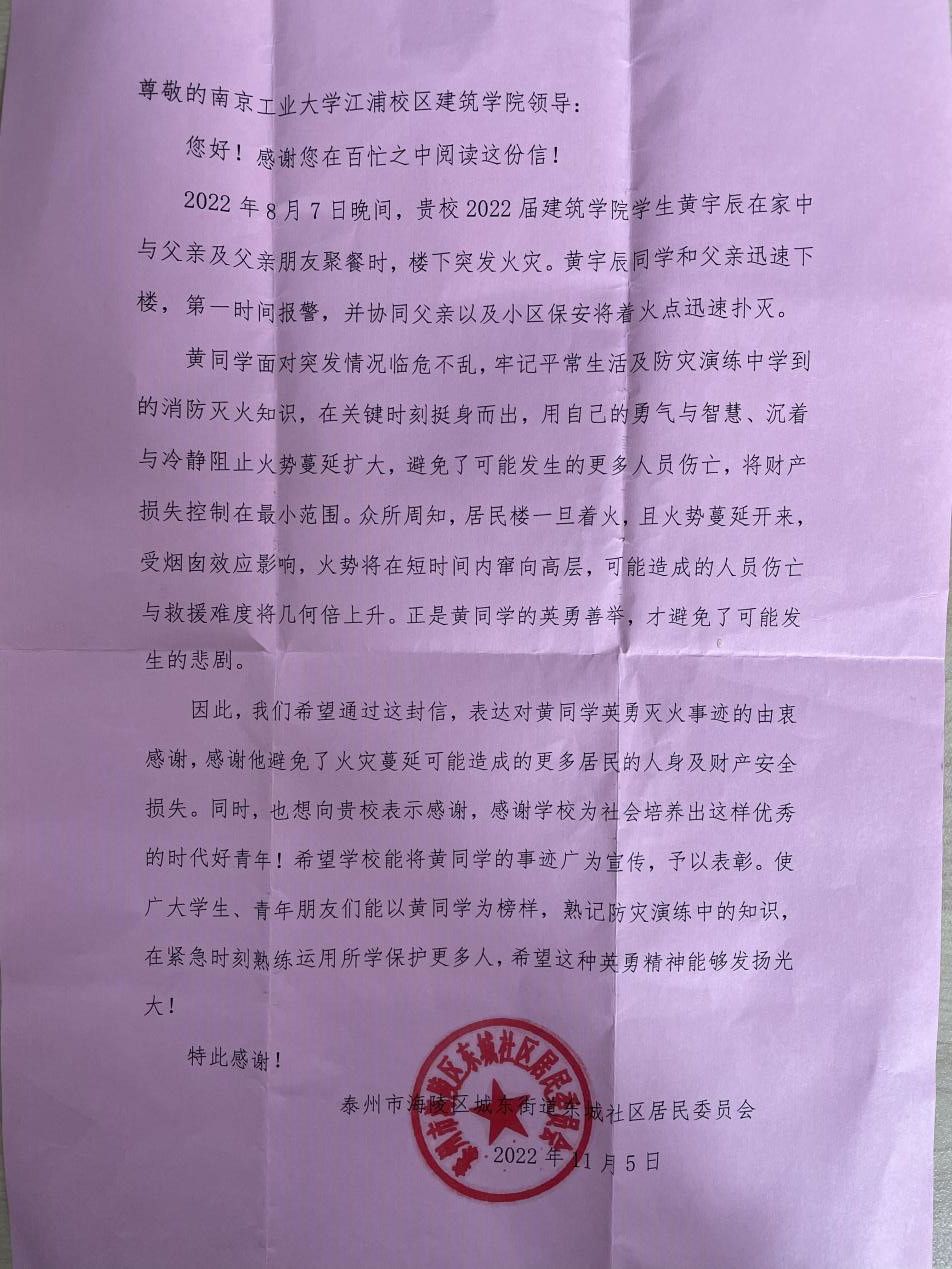 近日,江苏省泰州市海陵区城东街道东城社区居民委员会给best365官网寄来一封感谢信,信中通报表扬了公司2022级建筑学专业黄宇辰同学在火灾现场见义勇为的英勇善举。