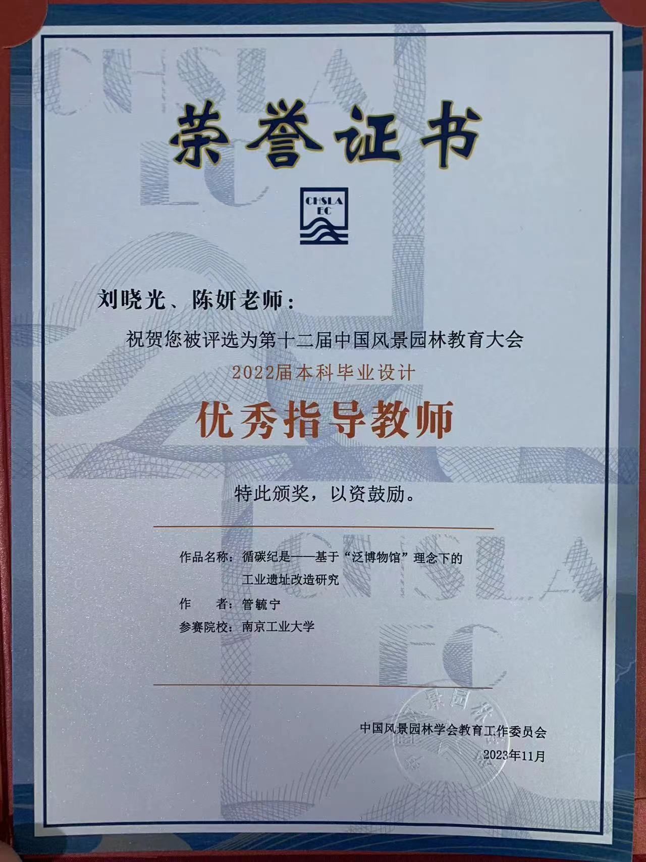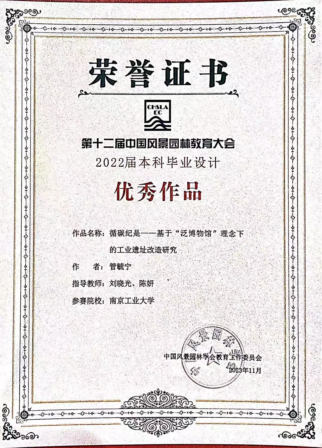 在同期举办的全国优秀本科毕业设计评选,共评选出30份优秀毕设作品。公司best365官网风景园林专业2022届毕业生管毓宁、吴蕴涵、黄君祎的毕业设计《循碳纪是:基于“泛博物馆”理念下的工业遗址改造研究》,在刘晓光、陈妍老师两位老师的悉心指导下,经过激烈的角逐,顺利通过初评与专家终评,喜获此项荣誉,两位老师荣获“优秀指导教师”称号。