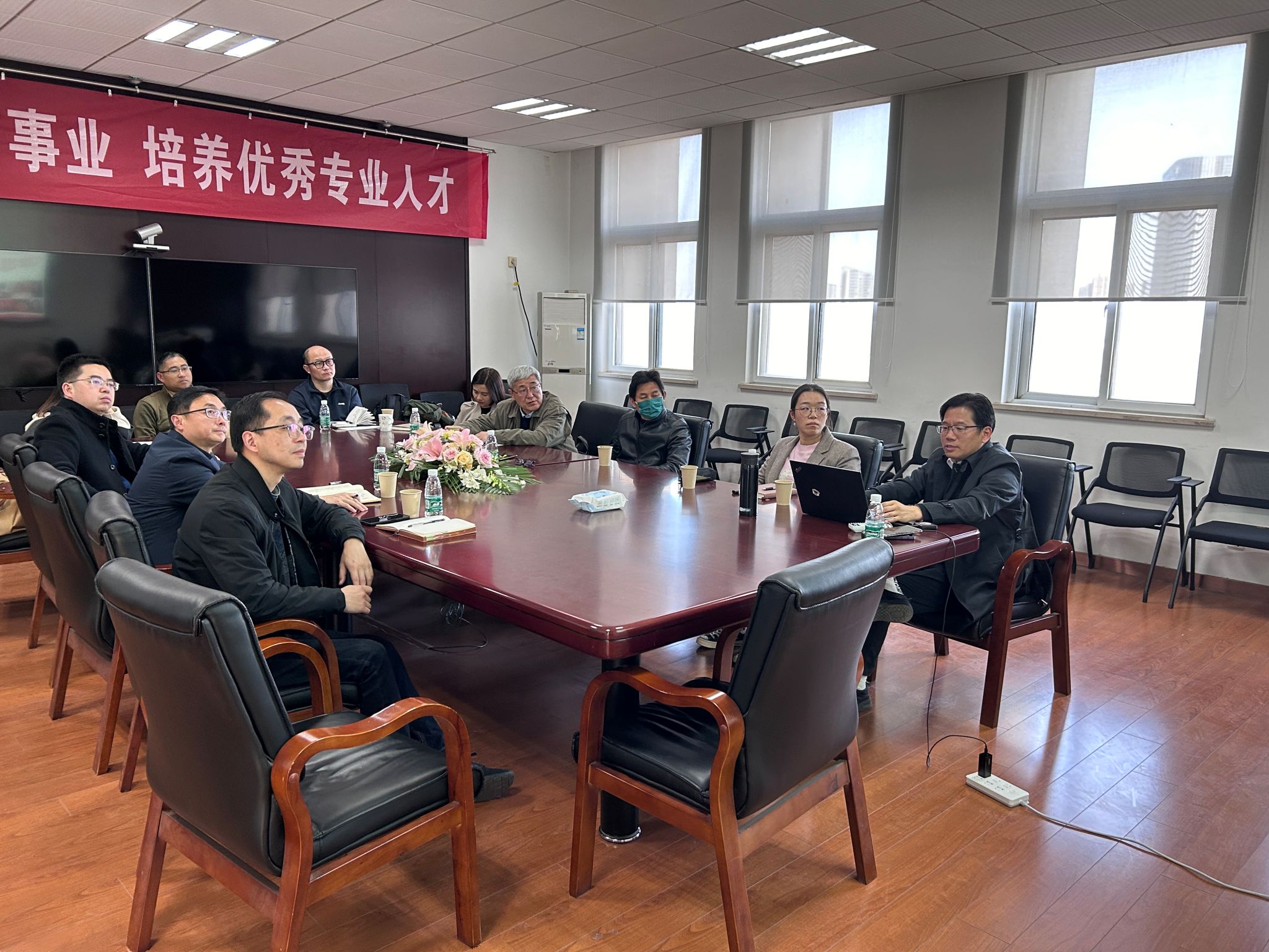 熊中宏书记代表公司对周甄川经理一行来院考察交流表示欢迎,蔡志昶副经理就公司发展、专业建设、专业评估、人才培养、实验室建设、实习实训等情况做了详细介绍,赵烨老师对公司的木结构建筑设计特色教学做了详细介绍。双方就建筑学专业建设和评估、人才培养、员工工作、实践基地等议题进行了深入探讨与交流。