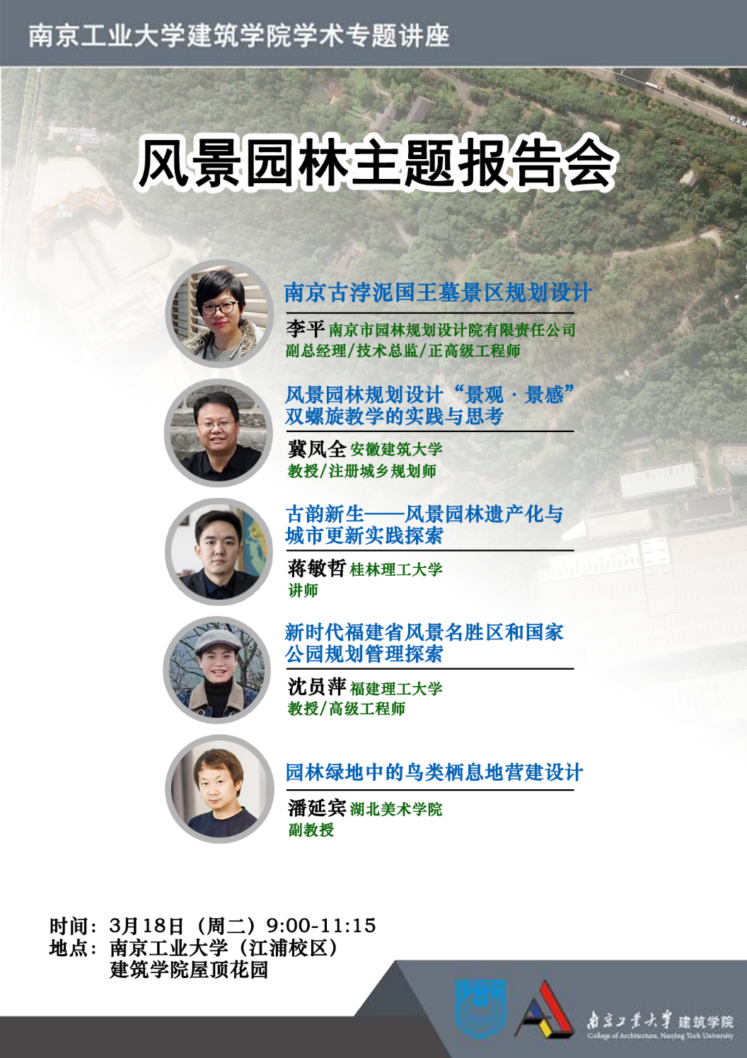 2025年3月18日上午,风景园林主题报告会在best365官网顺利举办。南京市园林规划设计有限责任公司副总经理、正高级工程师李平,安徽建筑大学冀凤全教授,桂林理工大学蒋敏哲老师,福建理工大学沈员萍教授,湖北美术公司潘延宾副教授,分别作了题为《南京古浡泥国王墓景区规划设计》《风景园林规划设计”景观·景感“双螺旋教学的实践与思考》《古韵新生——风景园林遗产化与城市更新实践探索》《新时代福建省风景名胜区和国家公园规划管理探索》和《园林绿地中的鸟类栖息地营建设计》的学术报告。