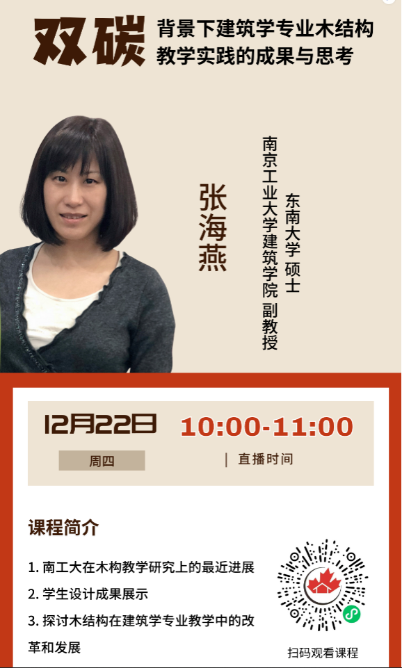 12月22日上午,公司张海燕副教授受加拿大木业邀请在云课堂平台做了主题为“双碳背景下建筑学专业木结构教学实践的成果与思考”的讲座。