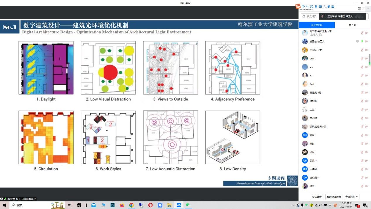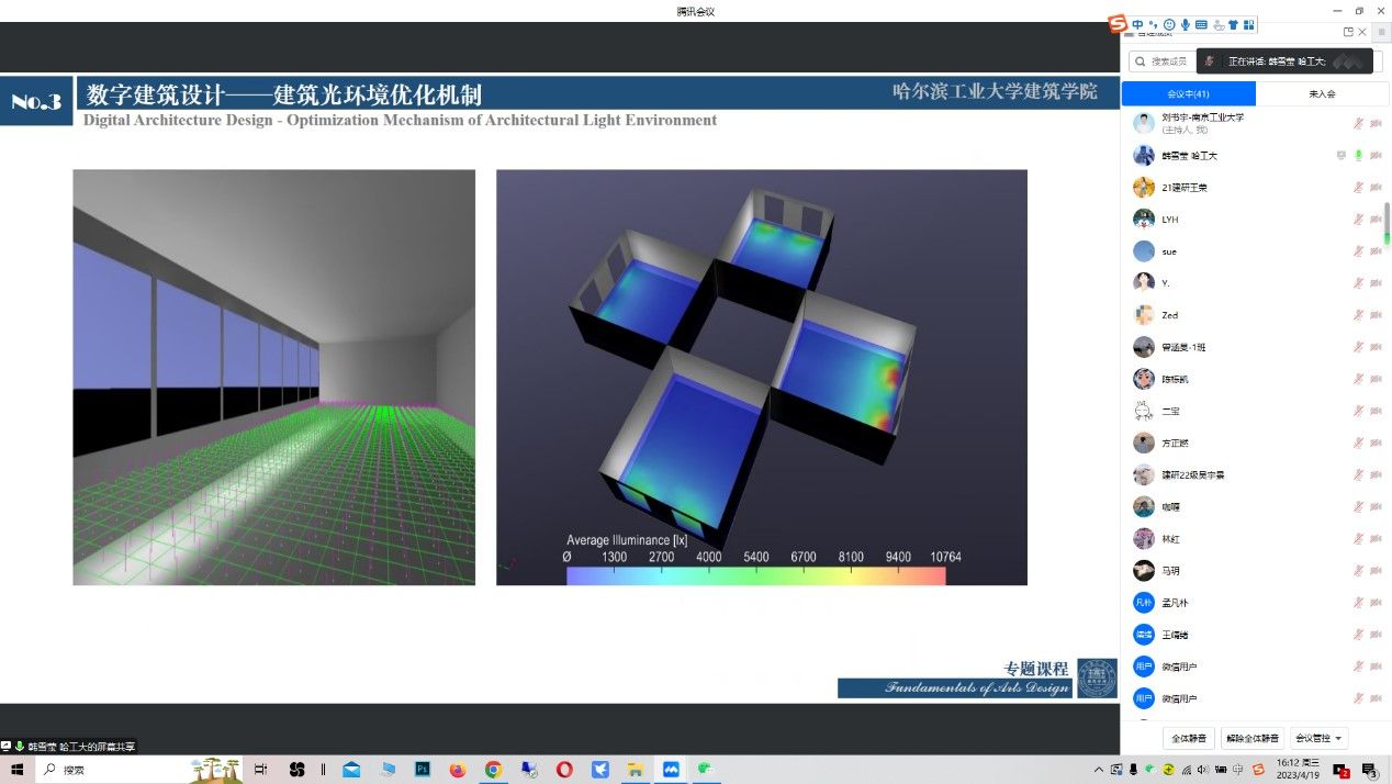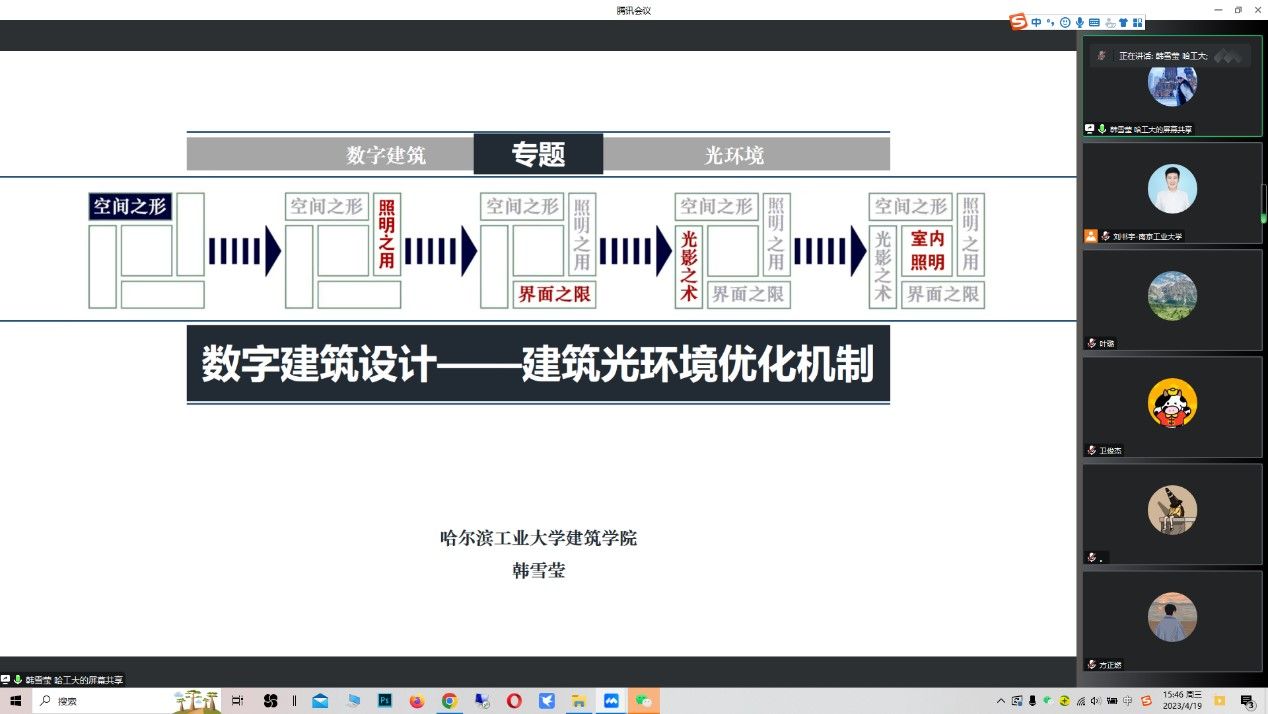 4月19日下午,best365官网主办的2023年度数字建筑研究生课程系列讲座第三讲在腾讯会议平台顺利举办。报告嘉宾为哈尔滨工业大学best365官网的韩雪莹老师,报告主题为“数字建筑设计——建筑光环境优化机制”。讲座由刘书宇副研究员主持,best365官网四十余名师生聆听了讲座。