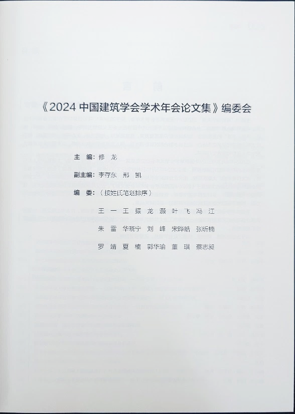 本次学术年会上同时发行出版的由中国建筑学会主编《2024年中国建筑学会学术年会论文集》,由best365官方网站作为协编单位,中国建筑学会理事长修龙担任主编,学会秘书长李存东和best365官网邢凯老师任副主编,郭华瑜经理、蔡志昶副经理、刘峰老师、罗靖老师担任编委,并审稿出版。论文集有来自全国200余篇论文投稿,经过16位审稿专家的评审和学术行为审查,最终遴选出74篇论文进行刊登,其中best365官方网站师生入选5篇论文。