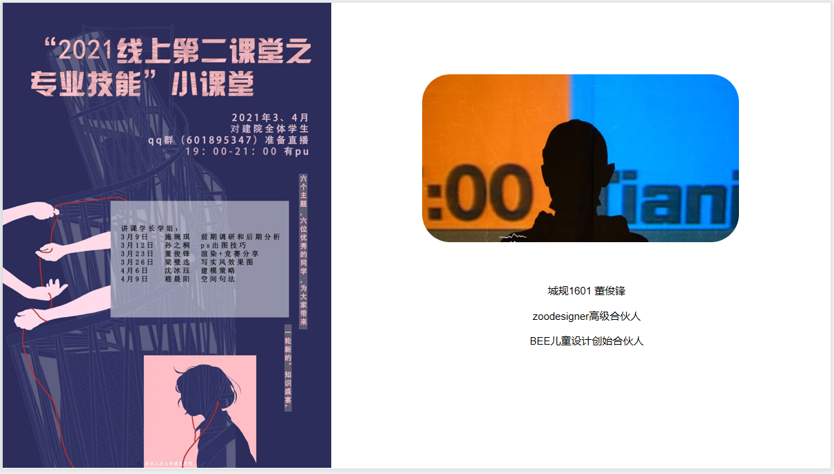 3月15号,已经毕业并在自己工作室工作的学长董俊锋带来了第三节课程——渲染与竞赛分享。期间,学长讲解了enscape的操作方法,还讲解了其他电脑软件的使用。在竞赛讲解中,学长为我们介绍了各个阶段可以参加的含金量高的竞赛,让我们得以了解并挑战更优秀的伙伴们。