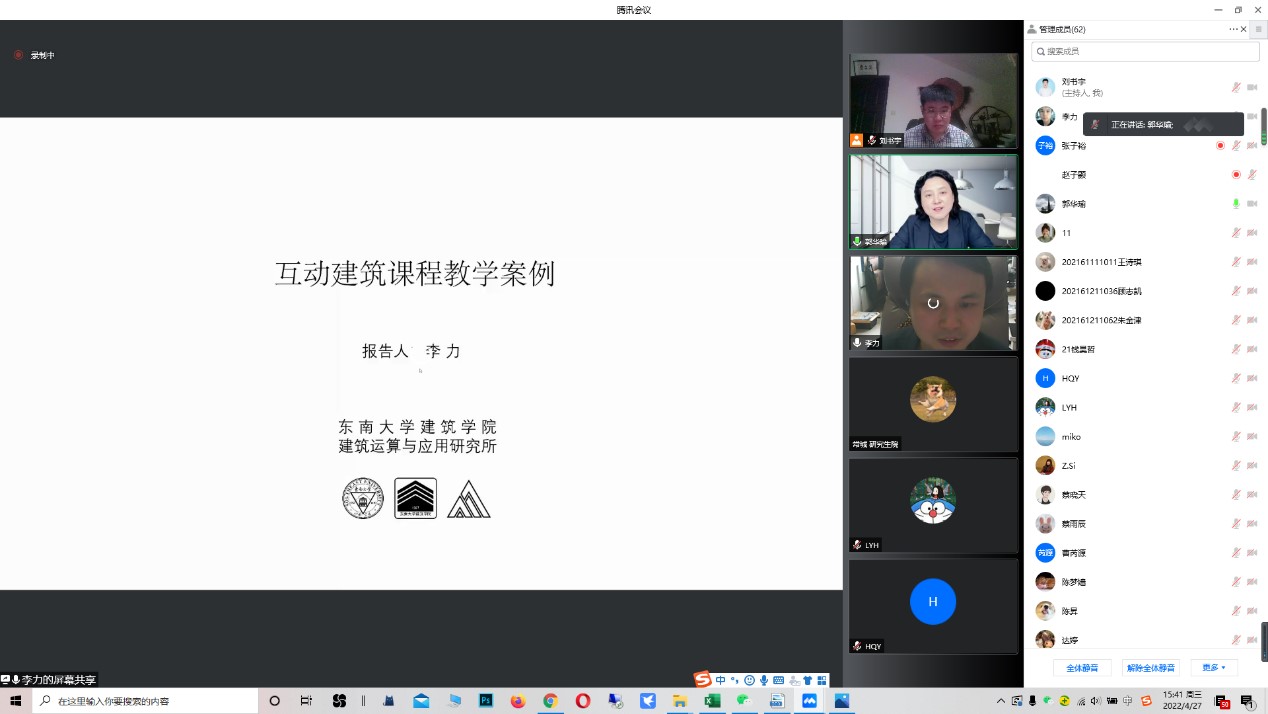 4月27日下午,best365官网主办的数字建筑系列讲座第四讲在腾讯会议平台顺利召开。东南大学best365官网建筑运算与应用研究所李力副研究员为公司师生带来了“互动建筑课程教学案例”主题报告。本次讲座由经理郭华瑜教授主持,公司近百名师生聆听了讲座。